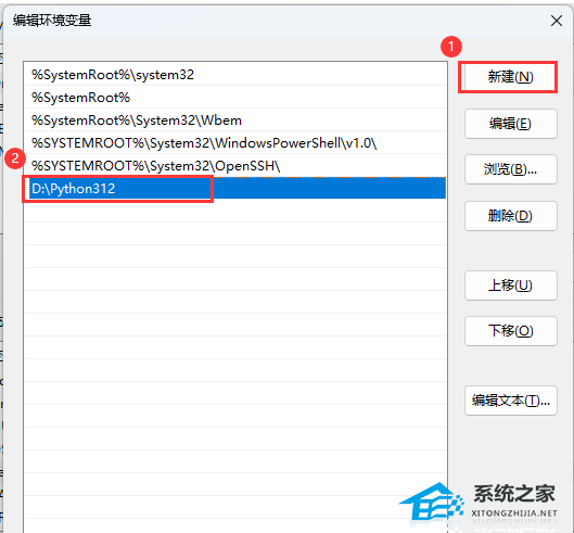 5. 编辑环境变量窗口,点击【新建】,然后填入【D:Python312(这是Python的安装路径)】。