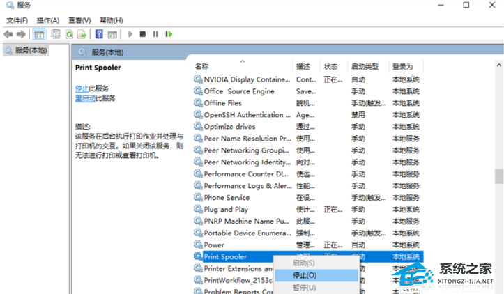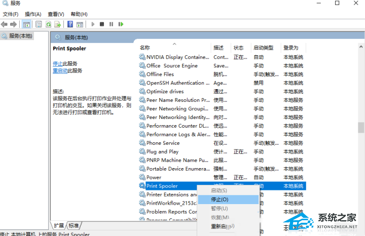 2. 服务窗口,找到名称为【Print Spooler】服务,并点击【右键】,在打开的菜单项中,选择【停止】;