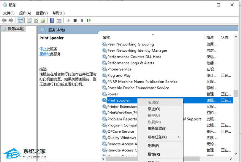 4. 服务窗口中,找到【Print Spooler】服务,点击【右键】,在打开的菜单项中,选择【启动(s)】,启动打印服务;