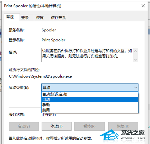 7. Print Spooler 的属性(本地计算机)窗口,将启动类型改为【自动】,再点击【确定】即可。