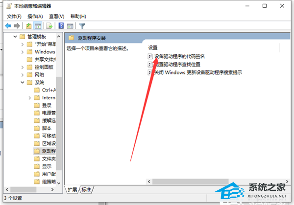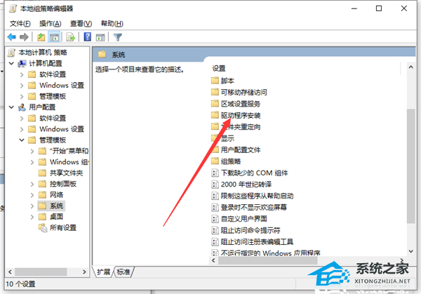 3. 在管理模板右侧双击“系统”文件夹,进入系统文件夹后,双击“驱动程序安装”文件夹。