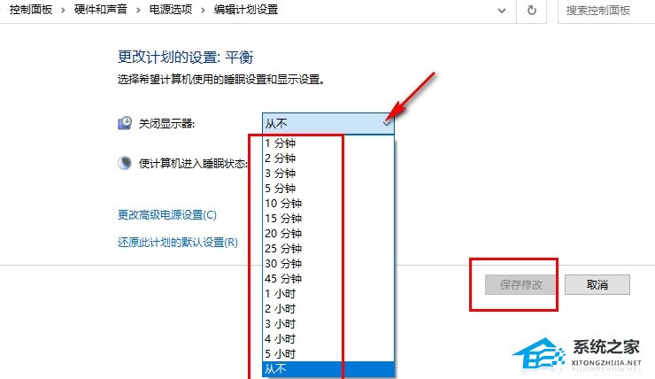 5. 进入到更改计划的窗口中,将【关闭显示器】选项后面的【从不】按钮点击打开,就可以选择自己需要关闭的时间,选择好之后点击保存修改按钮即可完成。