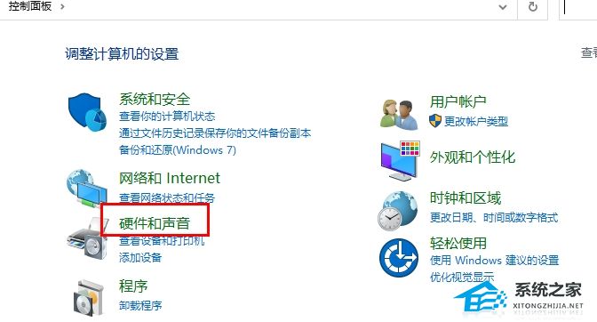 2. 弹出控制面板的页面,将查看方式设置为【类别】之后,即可在页面上找到【硬件和声音】选项进入。