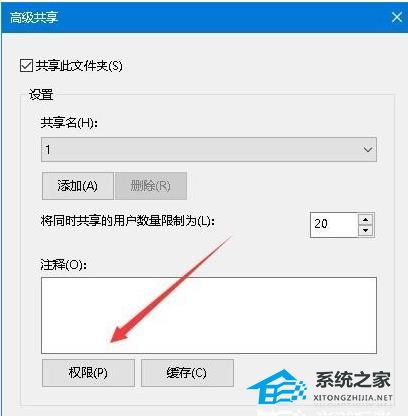 3. 这时可以打开高级共享窗口,点击窗口中的“权限”按钮。