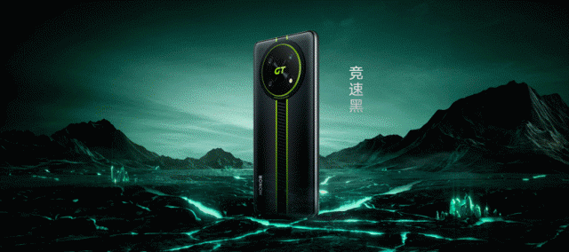 在竞速黑配色机身背面,覆盖了经典质感的碳纤纹理,视觉层面将战斗气息直接拉满。背部居中处还对齐覆盖了荧光绿、碳黑两色的经典撞色涂装,双荧光线条的纹理设计形似一条梦幻赛道,让人热血沸腾。赛道顶部贯穿着标志性的圆环相机模组,中间小圆内镭射出和赛道一体色的荧光绿“GT”字样,独具风格。
