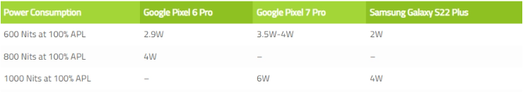 深入研究该机显示屏的功耗后发现,Pixel 7 Pro 在 600 尼特亮度时功耗约 3.5-4W,略低于最大亮度的一半。当触发高亮度模式时,即 1000 尼特左右,功耗就会来到 6W。他们跟不同公关渠道获得评测机的媒体确认过,都有类似的问题。