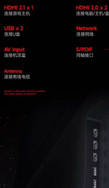 接口方面,该电视配备 HDMI 2.1、双 HDMI 2.0、双 USB 2.0、网线口、AV 输入口、S / PDIF 同轴接口、Antenna 接口。