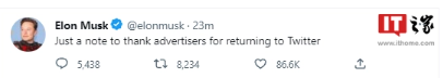 马斯克称苹果已全面恢复 Twitter 广告投放,并发文感谢广告主们重返推特
