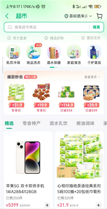 抖音超市的商品涵盖:乳饮冲调、纸品洗衣、酒水保健、家庭清洁,以及个护美妆、零食糖巧、母婴宠物、粮油速食、电器百货等品类。消费者购买后可以享受“当日发”的配送服务。据悉,抖音超市的商品都为官方直发,享受正品保障。