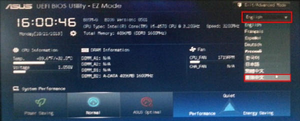 1、首先开机在出现华硕logo时按下热键进入bios设置,然后在右上角将语言改为“简体中文”