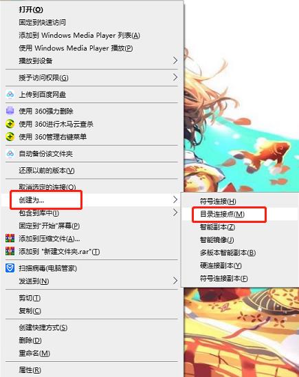 2、打开需要建立连接的目标目录,然后在空白出点击鼠标右键,选择创建为,在弹出的菜单中选择目录连接点即可;