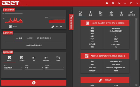 OCCT有4种不同的测试:CPU:OCCT,历史测试,非常准确,CPU:Linpack,流行的错误检测工具,GPU:3D,自定义3D测试和电源,它结合了CPU:Linpack和GPU:3D到加载你的电源。