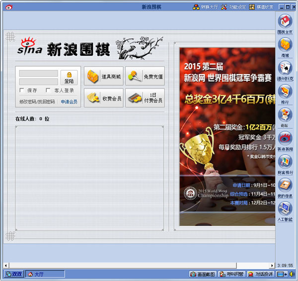 输入注册好的用户名和密码,点击连接按钮, 就会进入围棋大厅的初始登陆界面。
