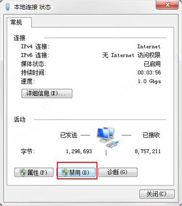 9、由于接下来的操作需要在没有的网络的情况下进行,所以需要进行断网,打开“本地连接”窗口中点击“禁用”按钮;