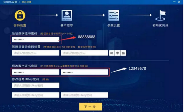 五、输入数字证书密码(初始密码88888888,建议修改成12345678),录入完毕点击“下一步”: