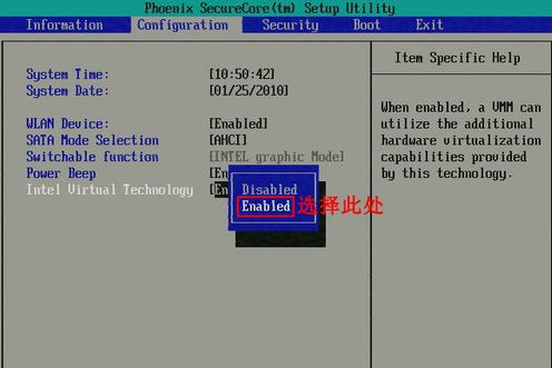 (1)进入BIOS,选择Configuration选项,选择Intel Virtual Technology并回车。
