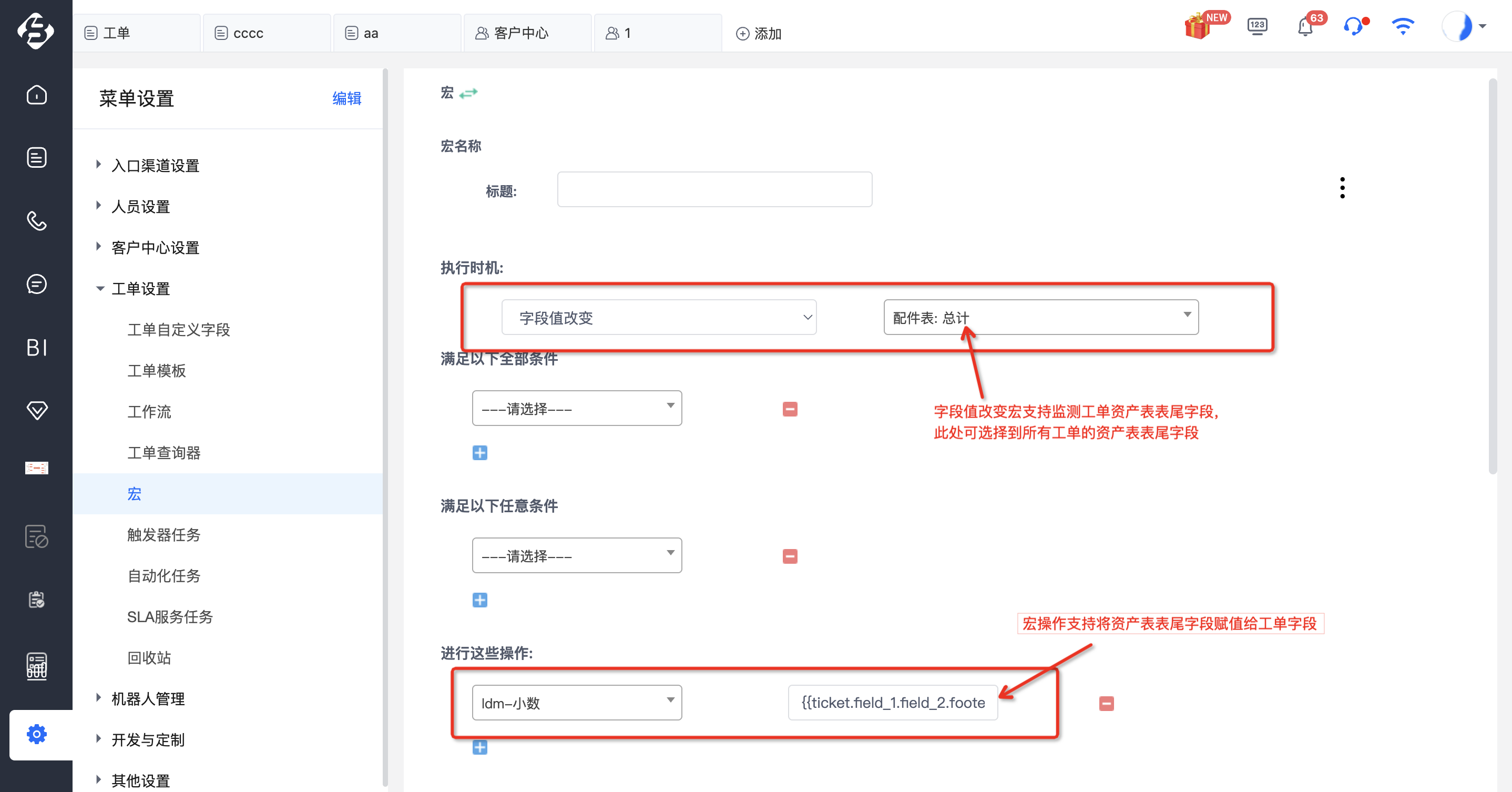 功能详情:如下图所示,字段值改变宏支持选择工单资产表的表尾字段,宏操作支持将工单资产表的表尾字段赋值到工单字段中(目前仅支持小数字段),资产表表尾字段的表达式为:{{ticket.field_1.field_2.footer}} ,其中field_1为工单资产表的唯一标识,field_2为资产表表尾字段的唯一标识。