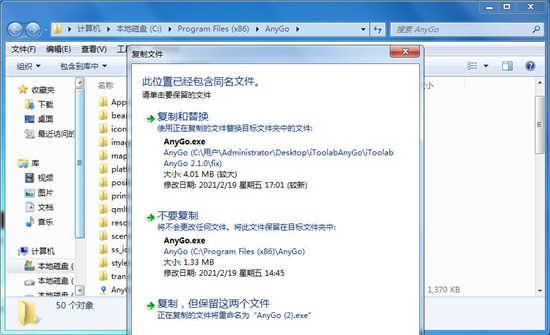 5、将AnyGo.exe复制到安装目录中,点击替换目标中的文件。