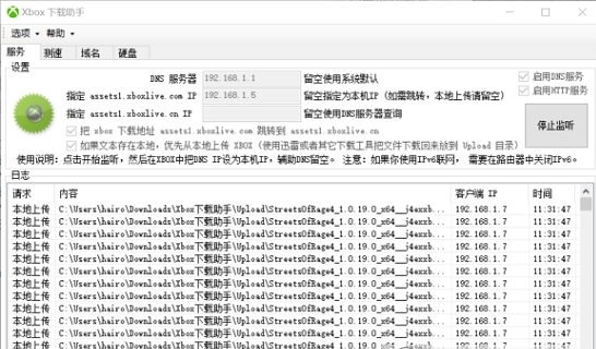 点击开始监听,然后在 XBOX 设置-》常规-》网络设置-》高级设置-》DNS设置-》手动 把 主DNS 设为本地IP地址,辅助DNS留空。