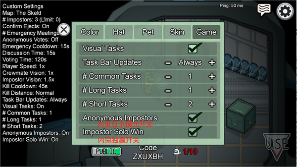 在大厅中,房主可以使用/anonymous on|off聊天中或直接在大厅设置中的命令启用内鬼互杀模式。