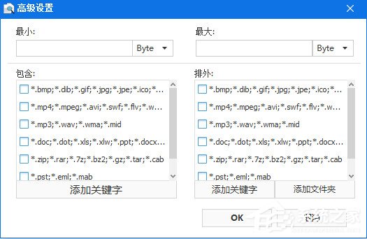 高级设置里面可以添加最大,最小字节数,文件格式,排外关键词来缩小查找范围。