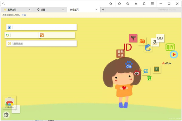 1, 快速访问页,可以自定义浏览器背景和启动页的收藏夹图标,将收藏夹中的网址添加到启动页,可以自定义图标文字和颜色,支持透明设置,并且可以像桌面一样随意拖动,不遮挡背景图片。