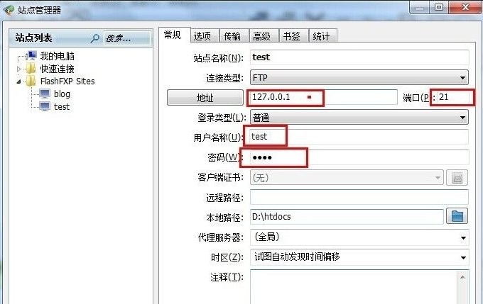 在常规面板,输入ftp空间的IP地址,端口,用户名称,密码,然后点击“应用”按钮,站点就设置好了。
