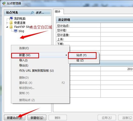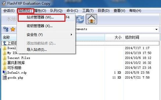 打开FlashFXP,在主菜单栏,点击“站点”-》“站点管理器”,快捷键为F4,将弹出站点管理器窗口。