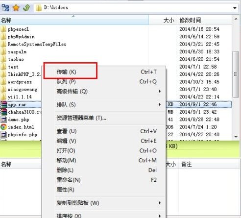 远程上传目录和本地上传文件确认好后,选中本地上传的文件后鼠标右键单击 “传输”。