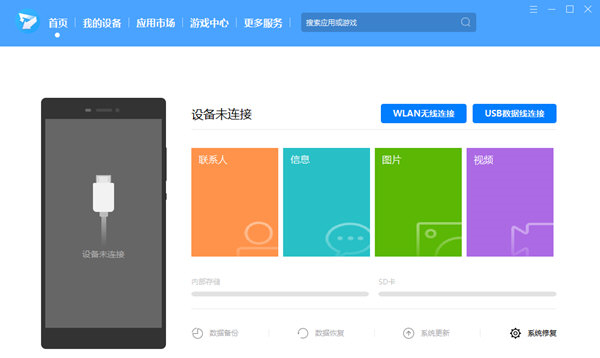备份与恢复:设备上的数据可备份至电脑,支持联系人、短信、应用程序、音乐、通话记录、Email、日程的备份;可将已备份数据恢复至设备。