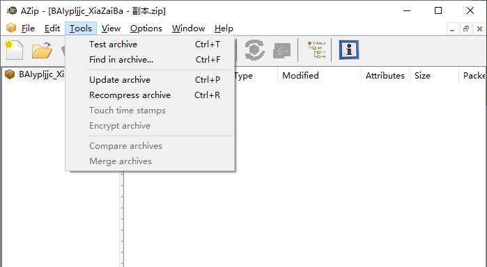 6. 工具菜单中可以选择使用测试存档,在存档中查找,更新存档,重新压缩存档,触摸时间戳等功能。