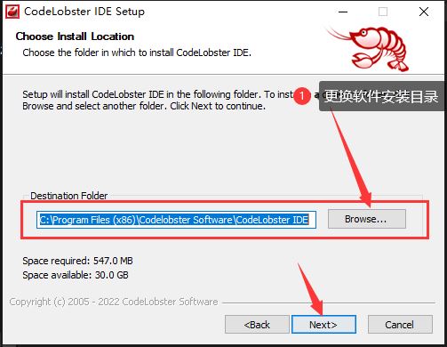 2. 点击browse更换软件安装目录,默认目录:C:\Program Files (x86)\Codelobster Software\CodeLobster IDE;如图。