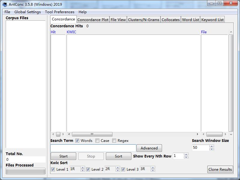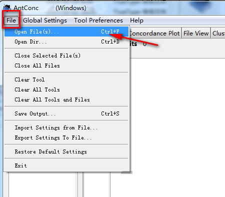 AntConc包括以下工具:素引**Concordance**索引定位**Concordance Plot**文件查看**File View**词丛**Clusters**N元模式(部分词丛)**N-Grams (part of Clusters)**搭配**Collocates**词单**WordList**关键词单**Keyword List**注意每个工具都可以点击工具窗口上各自的选项卡或者使用功能键F1至F7打开。