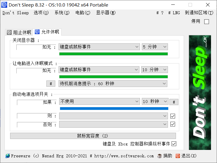 现在向大家推荐一款小软件,Don‘t Slee是一款小巧的便携软件,从它的名字上大家可以猜出他的作用,用来防止系统关机、待机休眠和重启。