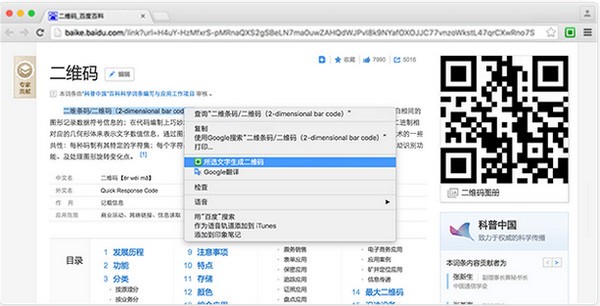 有时候看到页面上一段精彩的文字,想要快速保存到手机或是分享给朋友的时候,可以用鼠标复选这段文字,然后点击鼠标右键,选择“所选文字生成二维码”,马上可以将这段文字生成二维码。