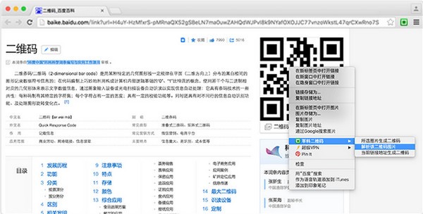 经常会在页面上碰到一些想要扫描的二维码,但是一时找不到手机,或者手机正在遥远的地方充电。这时候就可以在二维码上点击鼠标右键,选择“解析二维码图案”,就可以直接看到二维码指向的网址或者是内容。