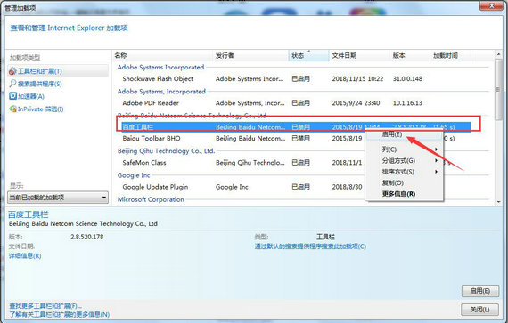 4、打开“管理加载项”后会弹出一个新的面板,如下图所示。在这里我们找到“百度工具栏”选中右击然后点击启动就可以了。这样就把百度工具栏添加到自己的浏览器中了,找不到它的小伙伴不妨试试看吧。