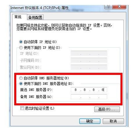 7、将使用下面的DNS服务地址中的的“首选DNS服务器地址”修改为8.8.8.8,点击确定即可正常更新或链接网易电竞平台。