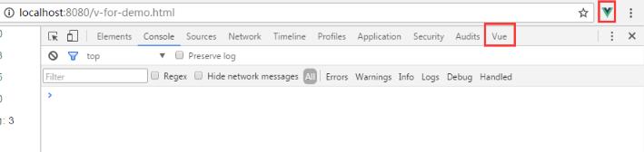 5、将本地的vue项目跑起来后,在浏览器打开你的项目,打开开发者模式,你会看见地址栏下边多出了vue选项。