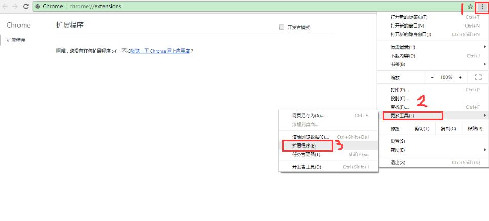 2、从设置-》更多工具-》扩展程序 打开扩展程序页面,或者地址栏输入 Chrome://extensions/ 按下回车打开扩展程序页面;