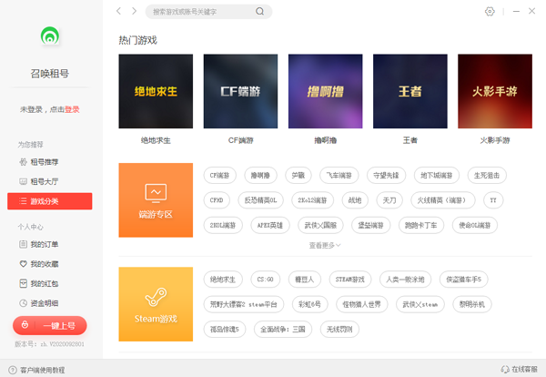 召唤租号是一款游戏租号平台,拥有着海量热门游戏的账号出粗,各种不同等级、段位游戏账号满足用户各种需求,便宜又安全,通过远程一键登录完全不担心账号的泄密等问题,保障用户账号安全!有需要的小伙伴快来下载使用吧!