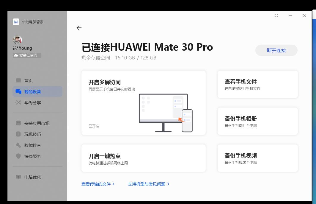 手机管理,轻松解决手机和计算机间的高速互联互通。“相册”、“音乐”完成与手机的自动连接并同步,实现手机照片、音乐的备份,解决手机内存不够的问题;“文件分享”与手机的“Huawei Share”完成文件的共享,实现多设备文件数据的直连免流量分享;一键热点直接将手机WLAN热点快速打开,实现电脑随时随地在网络条件下办公,在便捷上网的同时还能流量监控。~真的很方便!