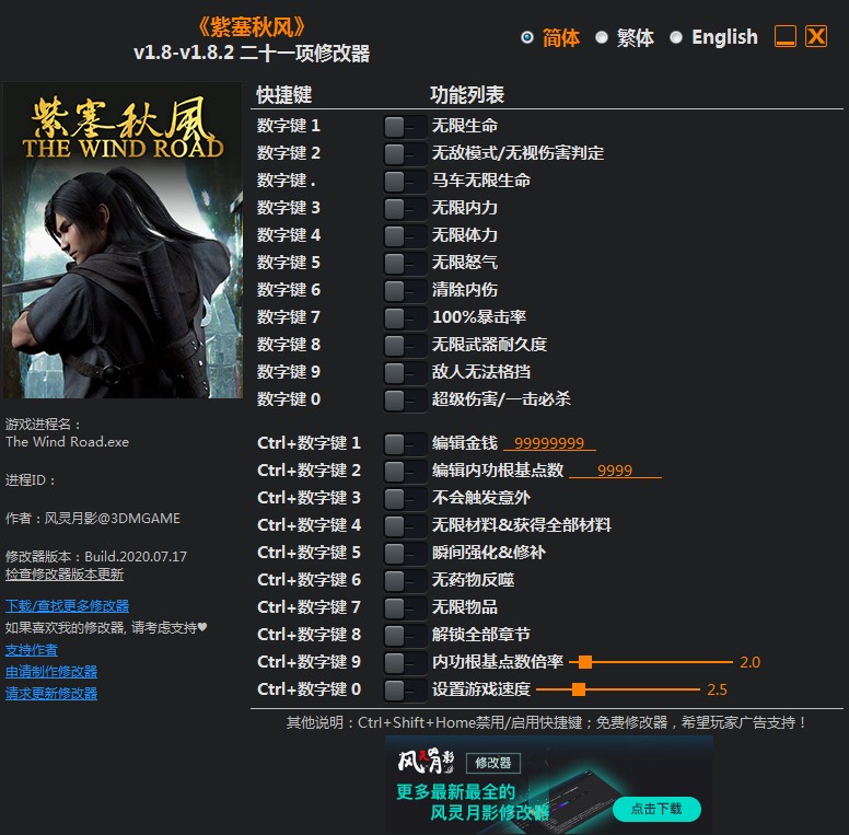 紫塞秋风二十一项修改器 V2020.07.17 官方安装版