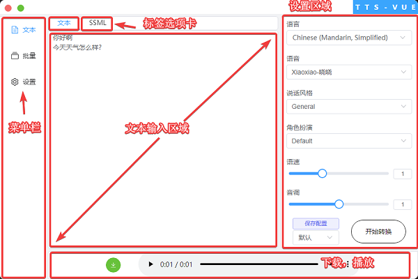 TTS-Vue是一款免费开源的微软语音合成助手,二十余种语音,多种说话风格,批量文字转语音功能。它使用 Web Speech API 将文本内容转换为语音,并提供了丰富的配置选项和语音效果,以满足用户的使用需求。