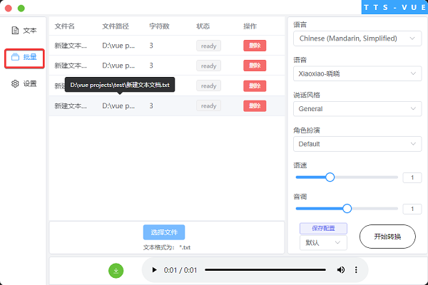 在批量菜单中,可以批量的将多个.txt文件转为.mp3文件。