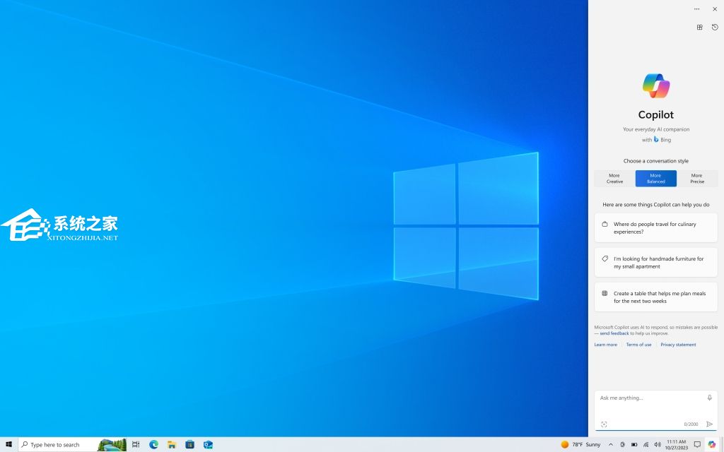 即将推出 – 我们将在 Windows 中引入Copilot(预览版)1 ,适用于运行 Windows 10 版本 22H2 家庭版和专业版2的设备。Windows 中的 Copilot按钮将出现在任务栏的右侧。选择它后,Windows 中的 Copilot 将出现在屏幕右侧。它不会与桌面内容重叠或阻止打开的应用程序窗口。