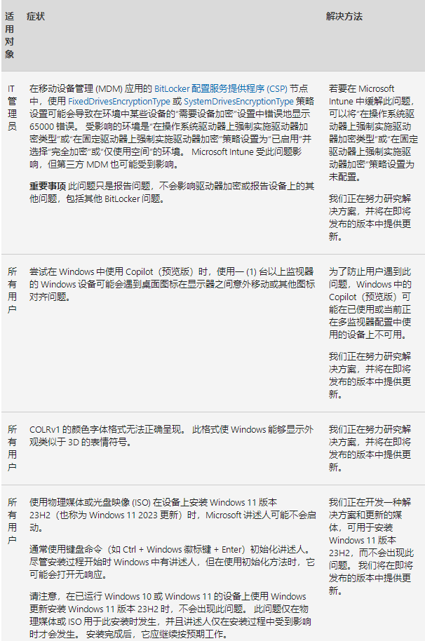 此更新中的已知问题