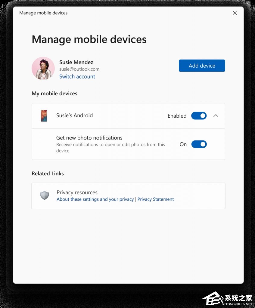 用于管理允许连接到您的电脑的移动设备的新设置窗口。