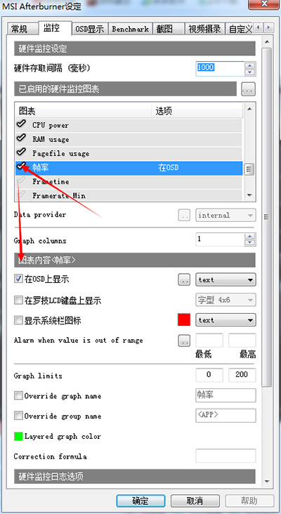 2. 进入设定界面后,选择监控,在”已启用的硬件监控图表“点击你想监控的项目,以帧率为例,使帧率项变成高亮的蓝色;拉动页面到最底部,在”在OSD上显示“前的方框打勾;要监测其他项目的话,就重复2和3(有点不人性化),最后点击确定。