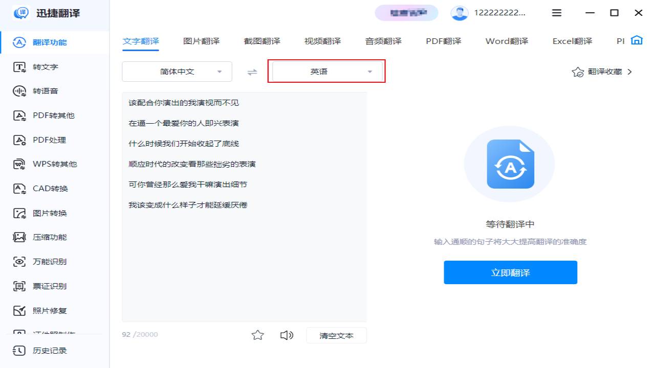 迅捷翻译是功能丰富的翻译软件,支持文字翻译、图片翻译、语音翻译、文档等多模式翻译,满足用户不同的翻译需求。迅捷翻译支持中文、英语、俄语、粤语等常见语种进行互译处理,还提供PDF转换、PDF处理、图片转换、照片修复、证件照制作等常用功能,供用户自由选择使用。